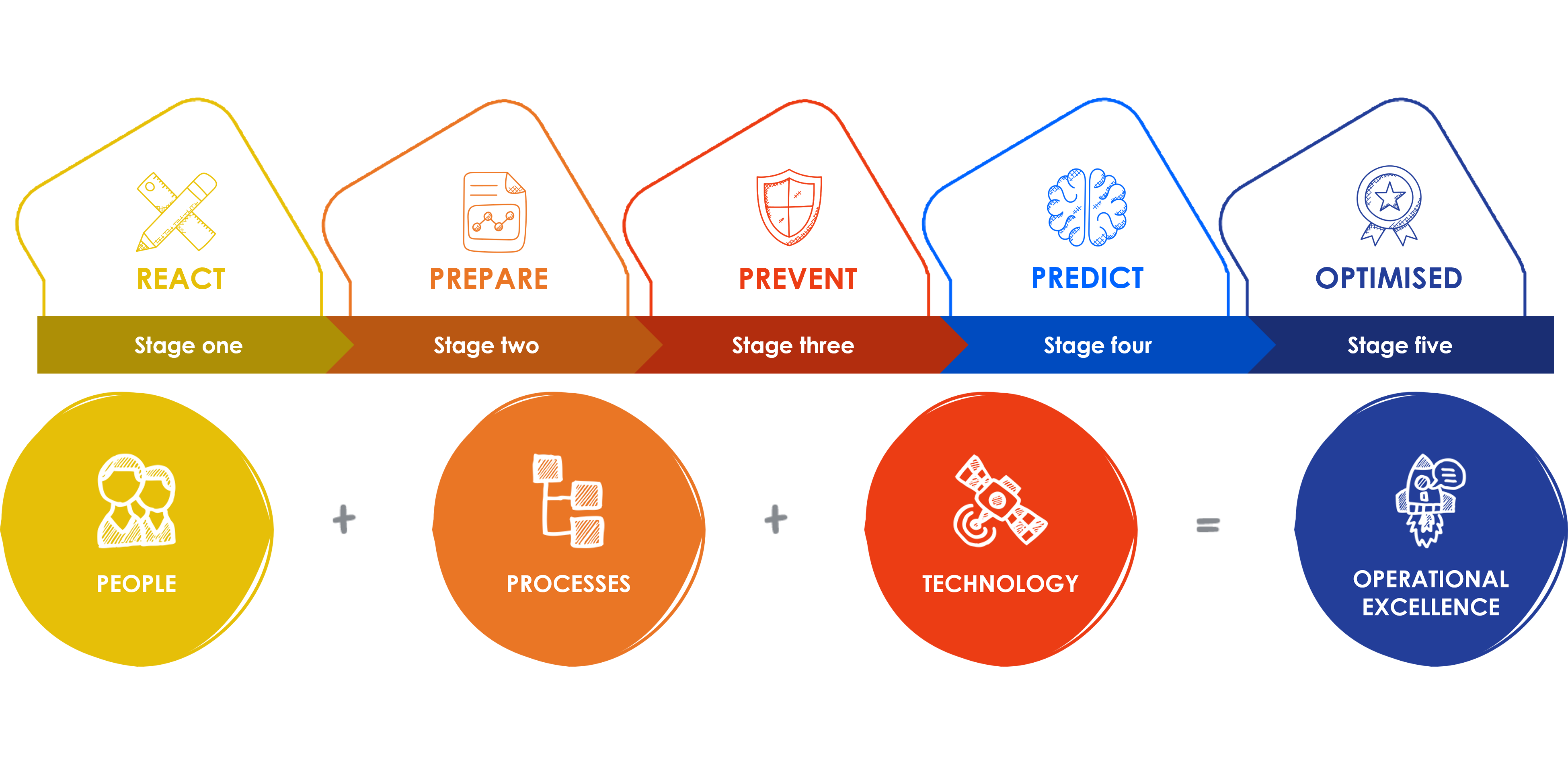 Denver utilises a Capability Maturity Model to assess our clients’ current state of maturity; often benchmarking against other organisations of similar size and industry to provide recommendations for improvement. The goals is to move closer to an optimised state. The Capability Maturity Model below uses a "traffic light” system (red, orange, and green), aligned with the five levels of the CMM to assess Governance, People, Process and Technology within each process – (Procure an Asset, Register an Asset, Corrective Maintenance, and Preventative Maintenance) under each Asset Category.